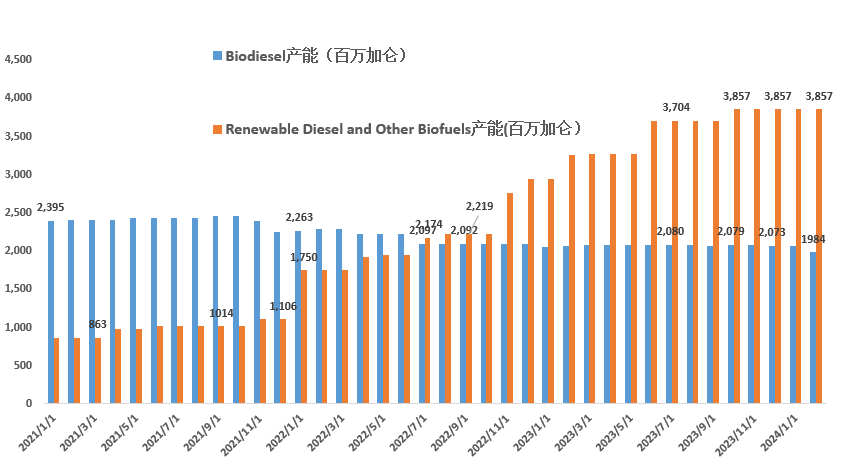2024年2月生物柴油的产能为19.8亿加仑,可再生柴油和其他生物燃料的产能为(这里面主要为可再生柴油产能,其他产能很少)为38.5亿加仑。对比2021年1月,生物柴油产能下降了4亿加仑,可再生和其他生物燃料的产能增加了30亿加仑。
