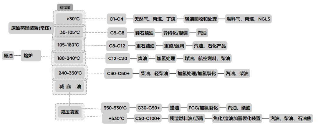 首先看一下原油的炼油原理:石油预处理之后,脱盐脱水,主要通过常压蒸馏和减压蒸馏装置进行一次加工。利用加热炉,分馏塔等设备将原油气化,烃(碳氢化合物的总称)类化合物在不同温度下开始蒸发,按照沸点从低到高排列,然后采用冷凝技术将这些气态的物质冷却为液体,冷凝后会从蒸馏塔中流出一系列轻质、中质和重质直馏馏分油。然后可以通过二次加工,可以精炼出更多的产品。本身可再生柴油装置可以在炼油厂的现有装置上进行协同处理(和原油一起混合进料)来生产可再生柴油,因此从工艺上,可再生柴油装置可以转化为生产可持续航空燃料。