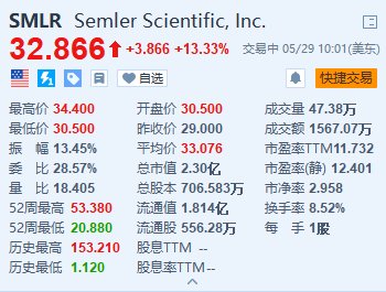 格隆汇5月29日|医疗保健提供商Semler Scientific(SMLR.US)续涨13.33%场外配资自查报告,报32.866美元。消息面上,该公司宣布采用比特币作为其主要储备资产,推动其股价隔夜收涨超24%。据悉,该公司已购买了581枚比特币,总价值为4000万美元,其中包括费用和开支。